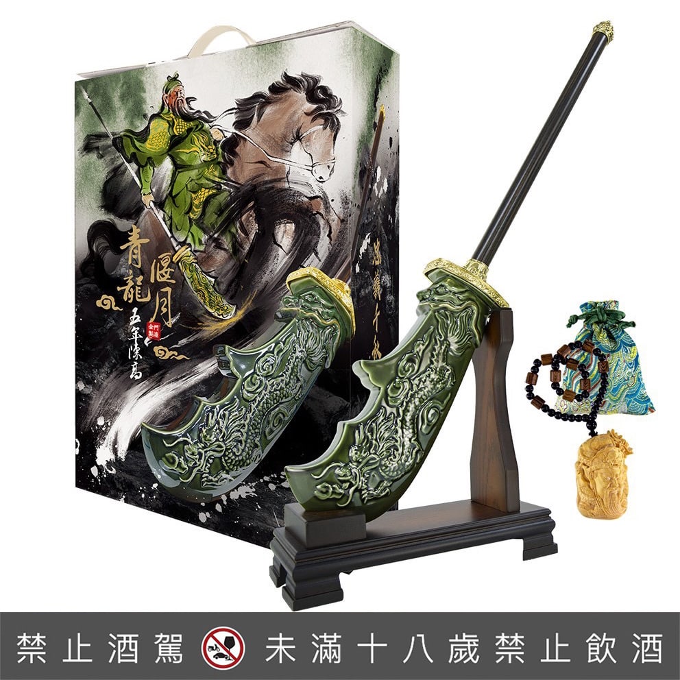 酒質:精緻雕琢的龍刻刀身,華麗典雅的金屬鑄件,展現橫掃千軍的磅礡氣勢。皇家酒廠特以推出青龍偃月陳年高粱酒,弘揚關公忠義精神。
