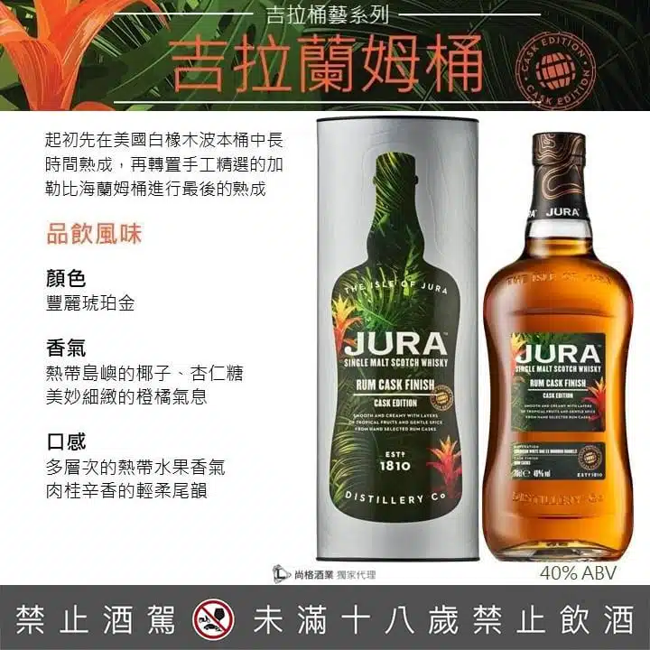 選用遠自熱情奔放的加勒比海蘭姆桶進行熟成,絲滑柔順、富含果香的精緻口感,甘甜溫潤的熱帶島嶼風情,令人久久無法忘懷。