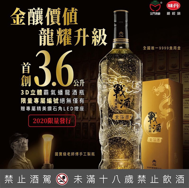 2020年限量「戰酒黑金龍金箔酒」產品設計再次「龍耀升級」,容量由3公升加大升級為3.6公升。酒瓶更跳脫一般平面直印,以陰陽雕的方式表現精雕細琢的蟠龍,龍頭氣宇軒昂,龍身栩栩如生,細膩又活靈活現,令人驚艷。