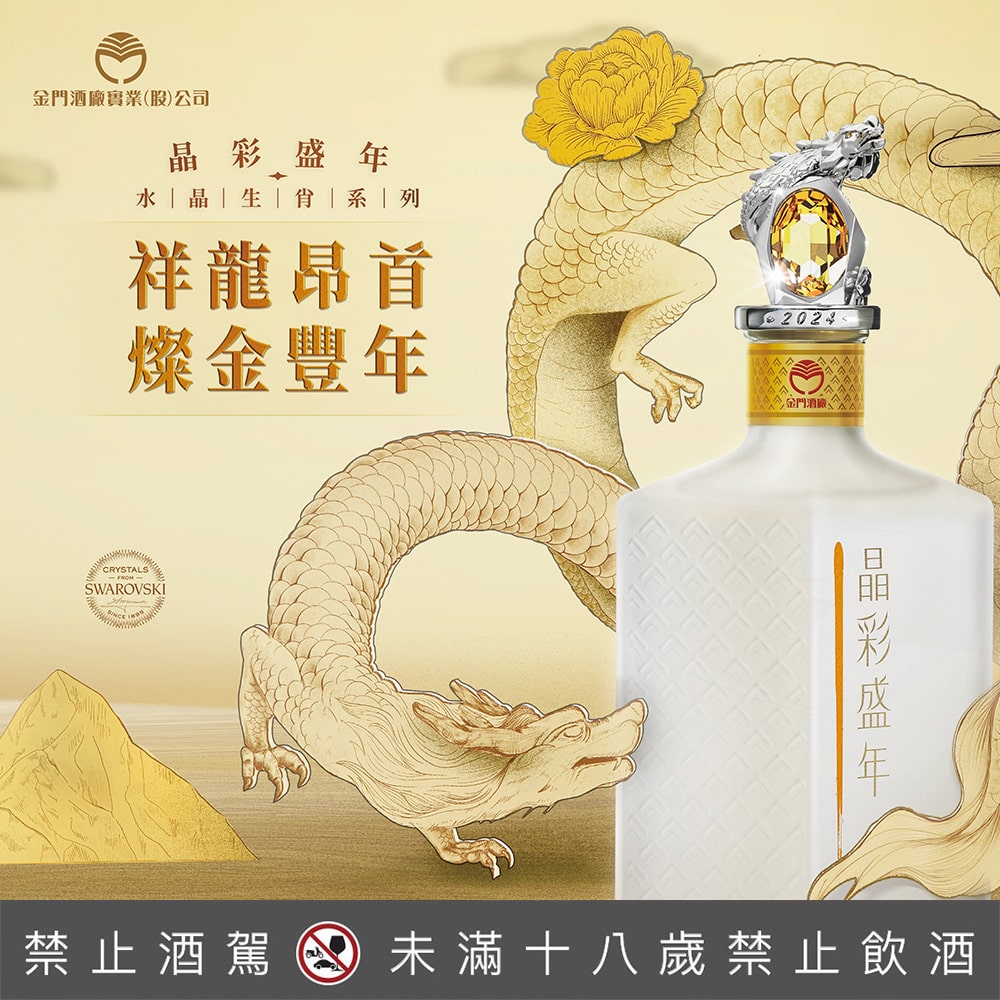 水晶生肖系列酒「晶彩盛年金門高粱酒-2024龍年版」,以生動的「龍抬頭」鑲嵌30mm Swarovski元素水晶,展現高貴質感,秉持著水晶生肖酒系列的祈願精神,企盼2024龍年龍運大發、收穫豐盛。黑松指出,古諺說「二月二,龍抬頭」,指的正是春季萬物即將復甦的景象,此款水晶生肖酒呼應了龍年豐收意涵,適逢歲末時節,不僅是生肖屬龍的長輩最佳禮品,更是龍寶寶的必備出生紀念酒,傳達了祈願成為「人中龍鳳」的好寓意。