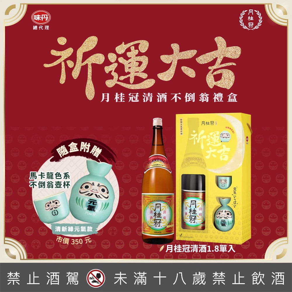 遵循日本杜氏『極正宗』釀造清酒技法,經過數十道釀造過程,淬取出滴滴醇美厚實月桂冠清酒;年節限量推出「祈運大吉」禮盒,隨盒附贈馬卡龍色系─清新綠元氣不倒翁壺杯,祝福來年身強體壯、活力旺盛每一天!