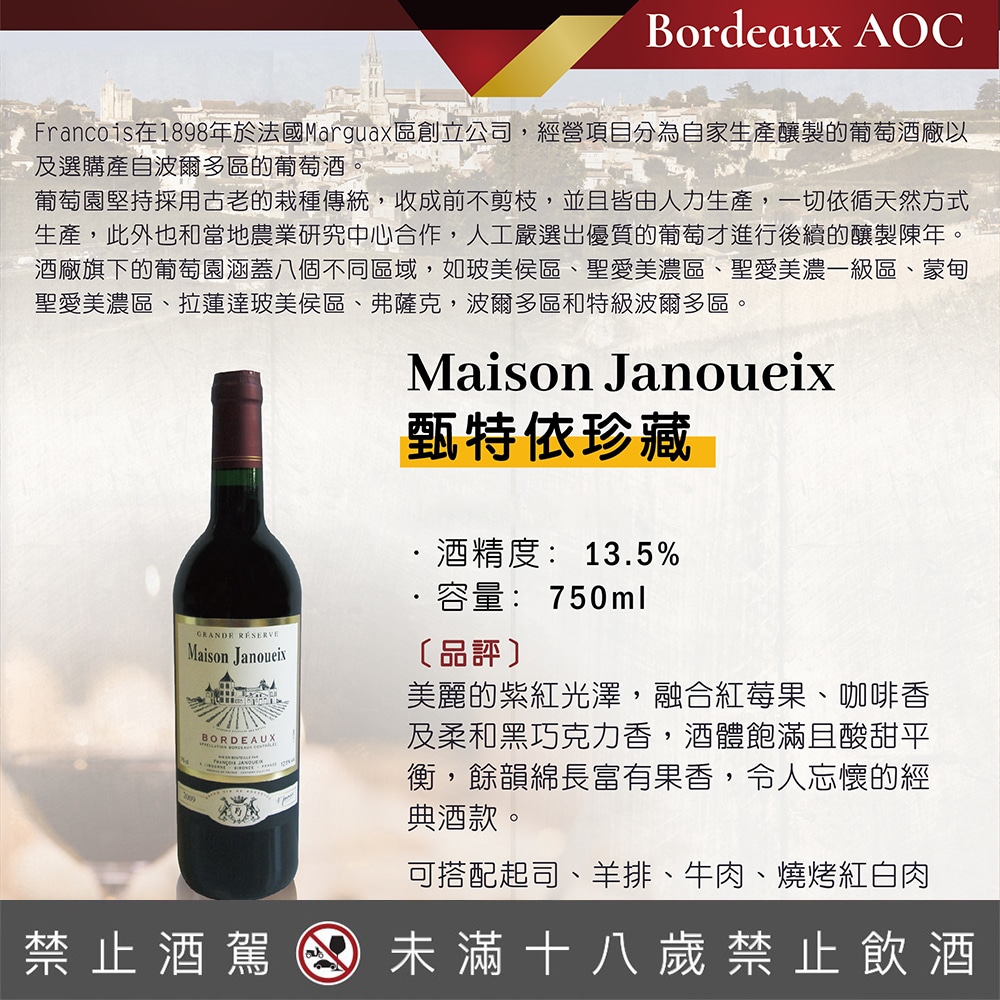 為美麗紫紅色,融合紅莓果、咖啡香及柔和黑巧克力香,酒體飽滿且酸甜平衡,餘韻綿長富有果香,讓您難以忘懷的經典酒款。可搭配起司、羊排、牛肉、燒烤白肉或紅肉。