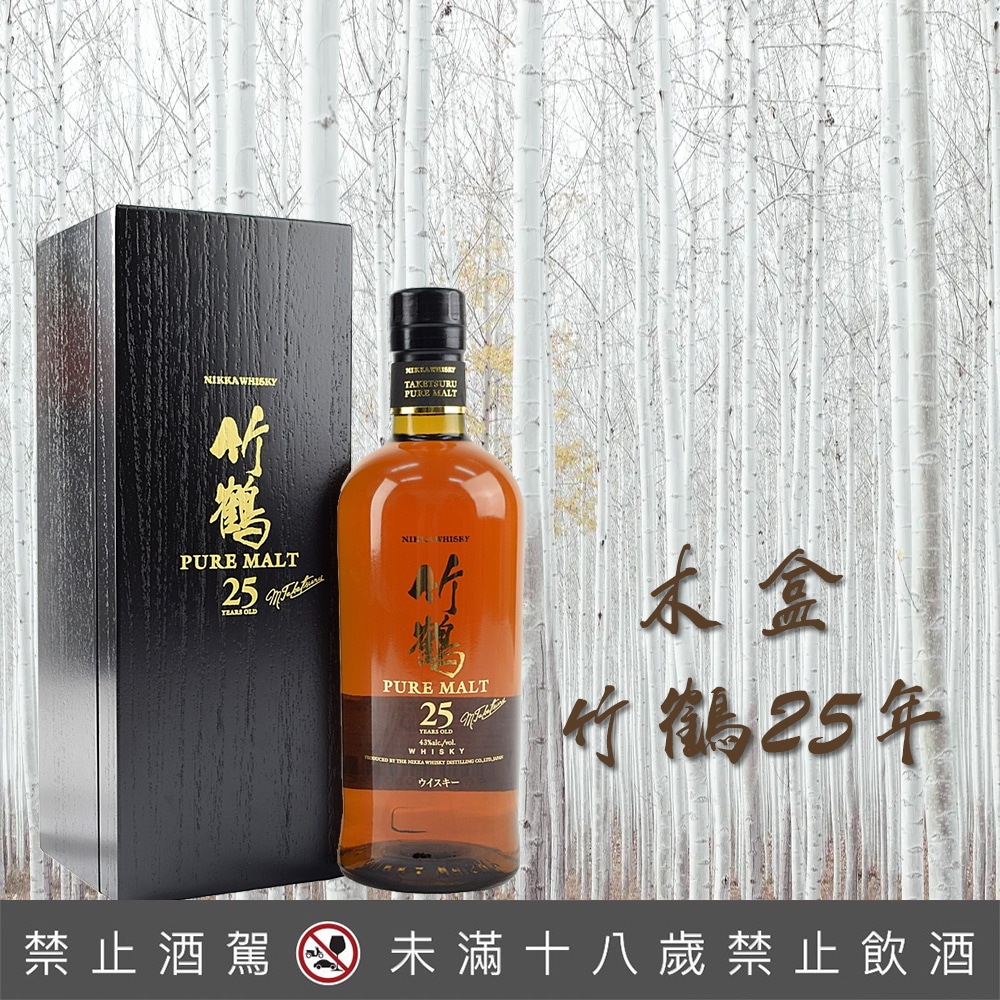 Nikka 竹鶴 25 年經典純麥威士忌,於2012年首次公開發售,全球分歐、亞、美區域限量發行,結合來自余市(Yoichi)和宮城峽(Miyagikyo)蒸餾廠的單一麥芽威士忌調配釀製而成。此酒款展現雪莉、花卉、優雅、泥炭等特色,口感達到絕妙的平衡。
