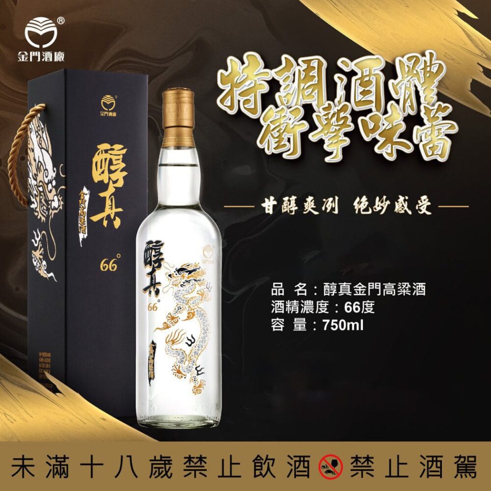 「醇真66度金門高粱酒」是目前金門酒廠市售酒精度最高的酒品之一,但它並不只是酒精度高而已,而是由金門酒廠酒體設計中心專案特調酒體,從金酒的五大酒窖中,挑選金城廠和金寧廠2~8年窖藏優質頭段酒心,特別加入10年金城老廠陳高,及本土契作糯紅高粱酒基精心調合而成,造就甘醇爽冽、香郁醇真的風味,與令人難忘的絕妙感受。