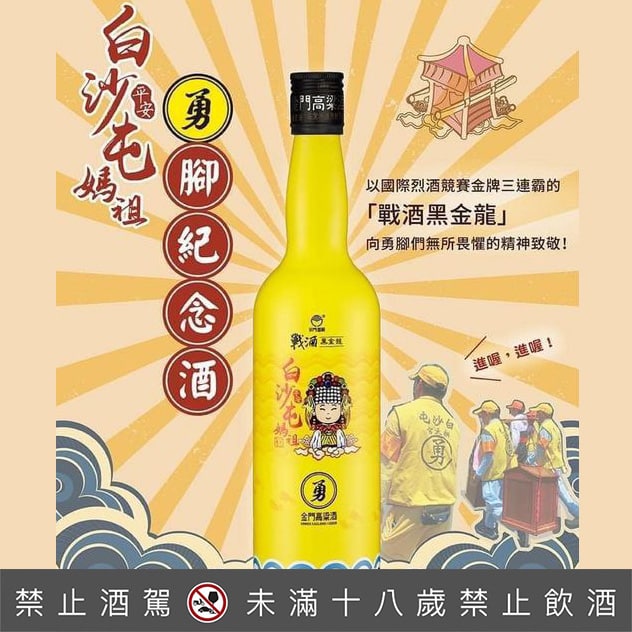 「戰酒黑金龍.白沙屯媽祖勇腳紀念酒」選用國際烈酒金牌三連霸的戰酒黑金龍,以帶有淡雅梅香的56度、花香四溢的59度、清新果香的66度等老酒調和而成,是協調性極佳、口感醇順平衡的難得佳釀。