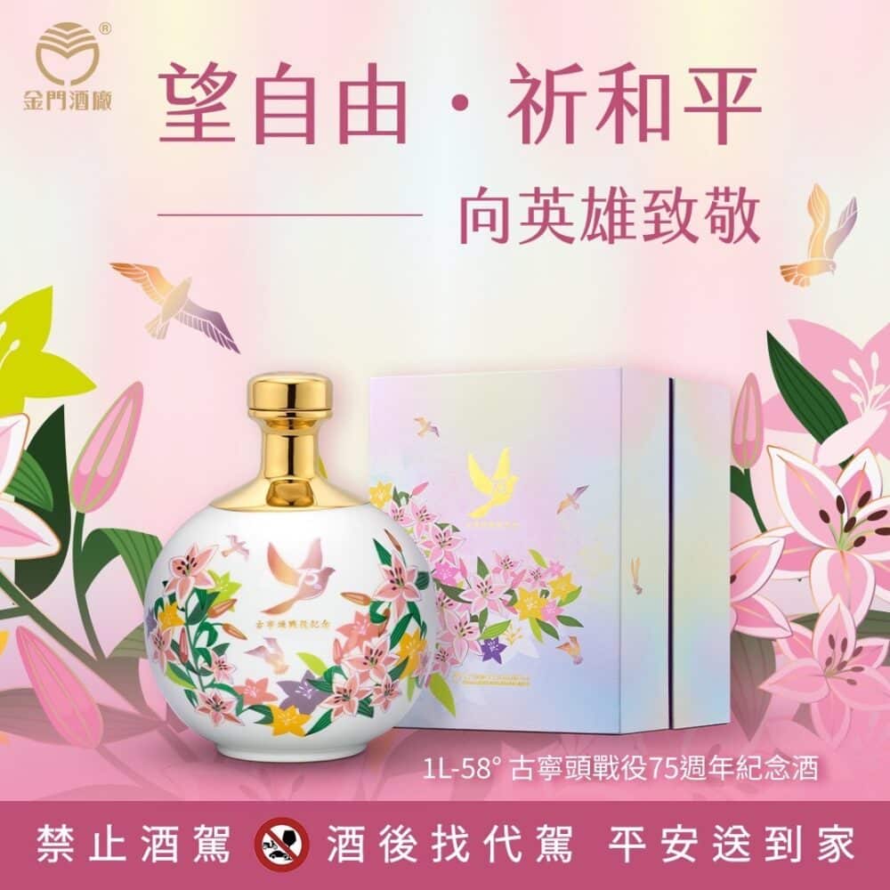 金門酒廠用心規劃,隆重推出「1L-58度 古寧頭戰役75週年紀念酒」,並以象徵無瑕的純白瓷瓶為底,環繞著色彩繽紛的百合花與展翅翱翔的和平鴿,呈現戰爭過後對和平與自由的追求。百合花語代表純潔、高貴、優雅,和平鴿象徵著友誼、團結與聖潔。瓶身上飛翔的和平鴿承載著「75」這個重要的數字,象徵著75年來,因珍視和平而使繁榮之花處處綻放。