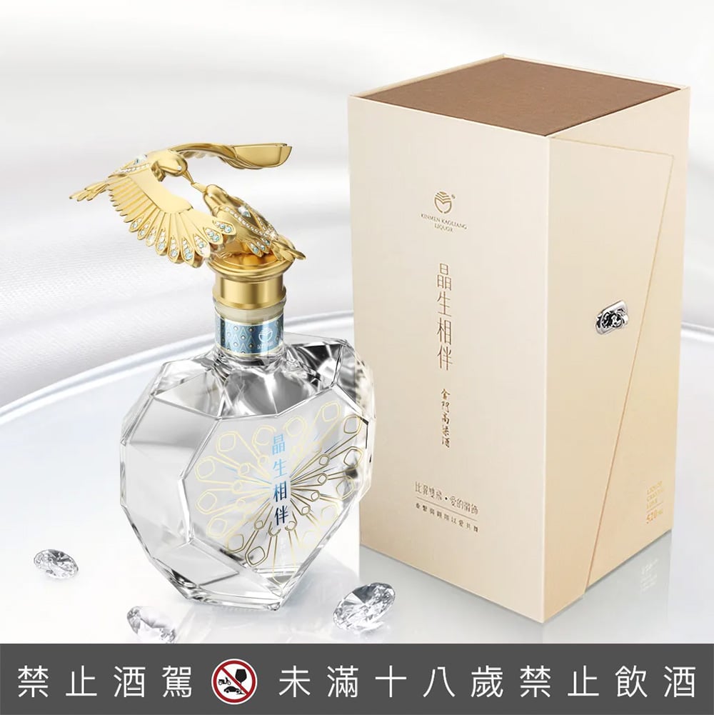 晶生相伴金門高粱酒的心形瓶身設計,猶如鑽石的晶亮璀璨,承載著愛與晶粹的承諾。