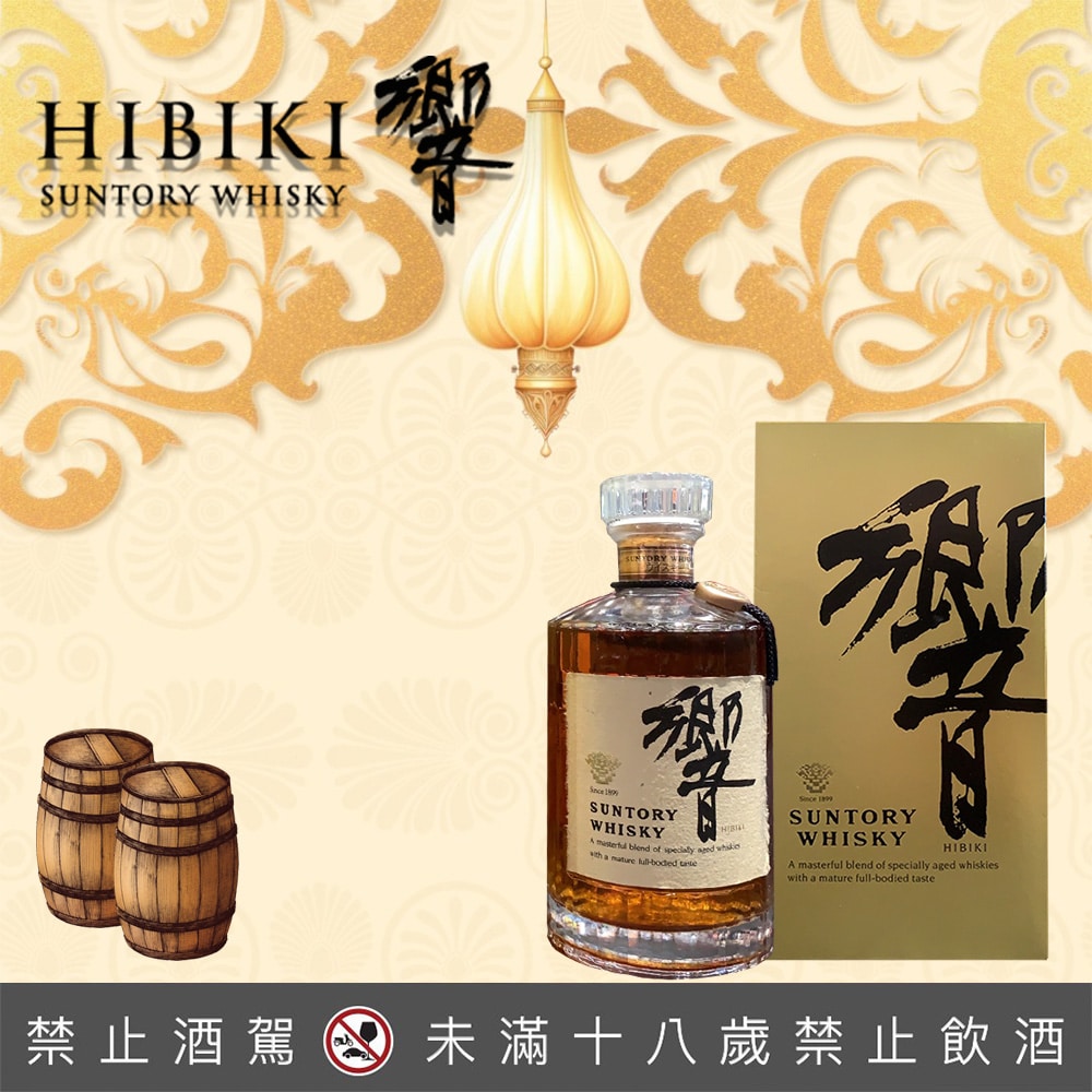 「響」融合了山崎蒸餾所熟成20年以上的麥芽原酒共36種,帶有哈密瓜、白桃、茉莉般的香氣,又有由北海道水楢橡木桶特有的沉香,淺紅琥珀色的酒液口感醇厚溫和,富有日本的溫婉風味。「響」的各款威士忌都需要長時間熟成,因此「響」非常重視時間的概念,從它的包裝上就可以看出這一點。