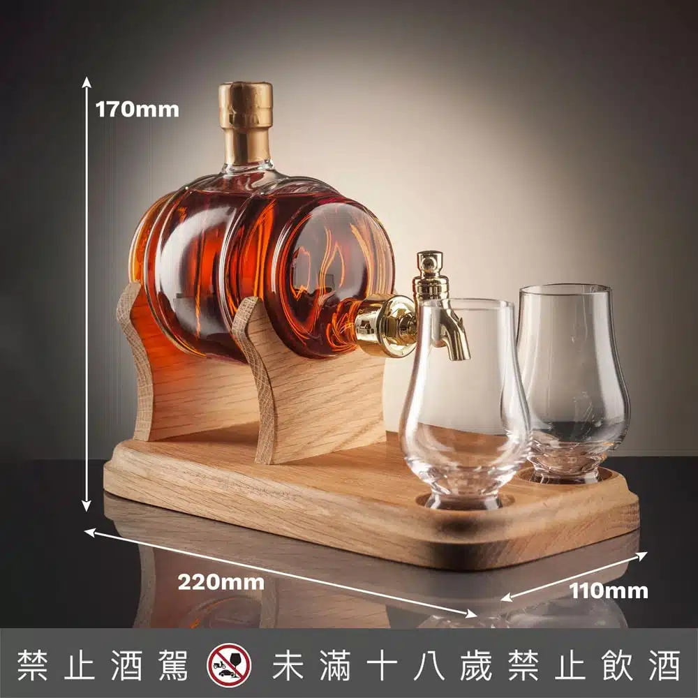 一款真正獨特的口吹橡木桶造型威士忌,手工製作的實木底座和2個小酒杯上,每個橡木桶造型威士忌都裝有350毫升的高地麥芽蘇格蘭威士忌。